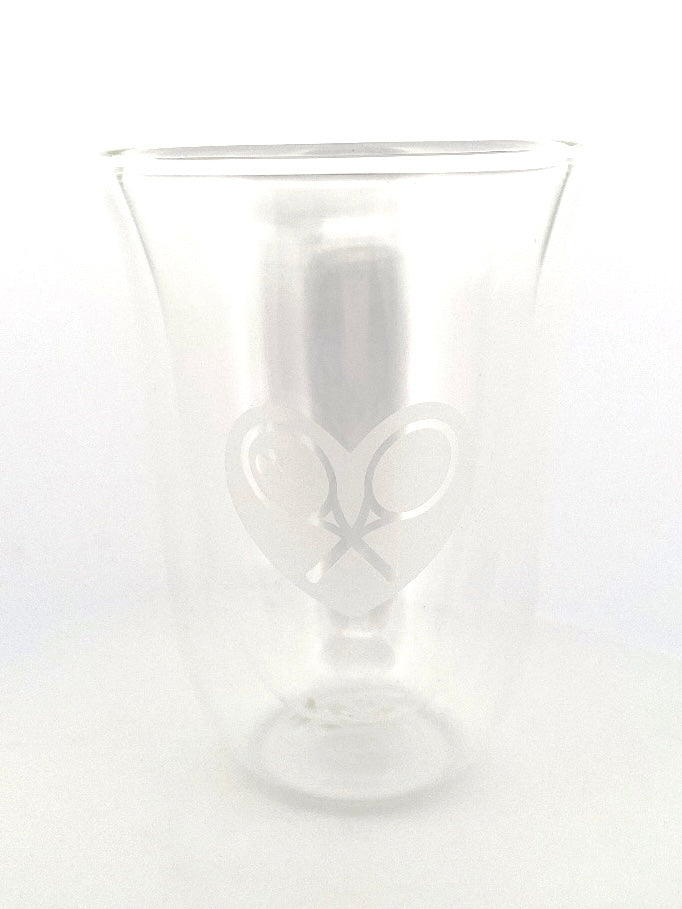 Super cute double walled drinking glass with our Heart & Racket logo.  Use for hot or cold drinks - it doesn't leave a mark on the table.