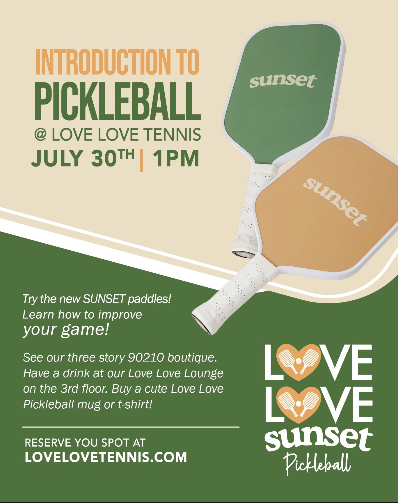 Join us on July 30th at 1pm, at Love Love Tennis Beverly Hills Boutique for an unforgettable "Introduction to Pickleball" event. Prepare for an afternoon packed with laughter, learning, and pure pickleball bliss!