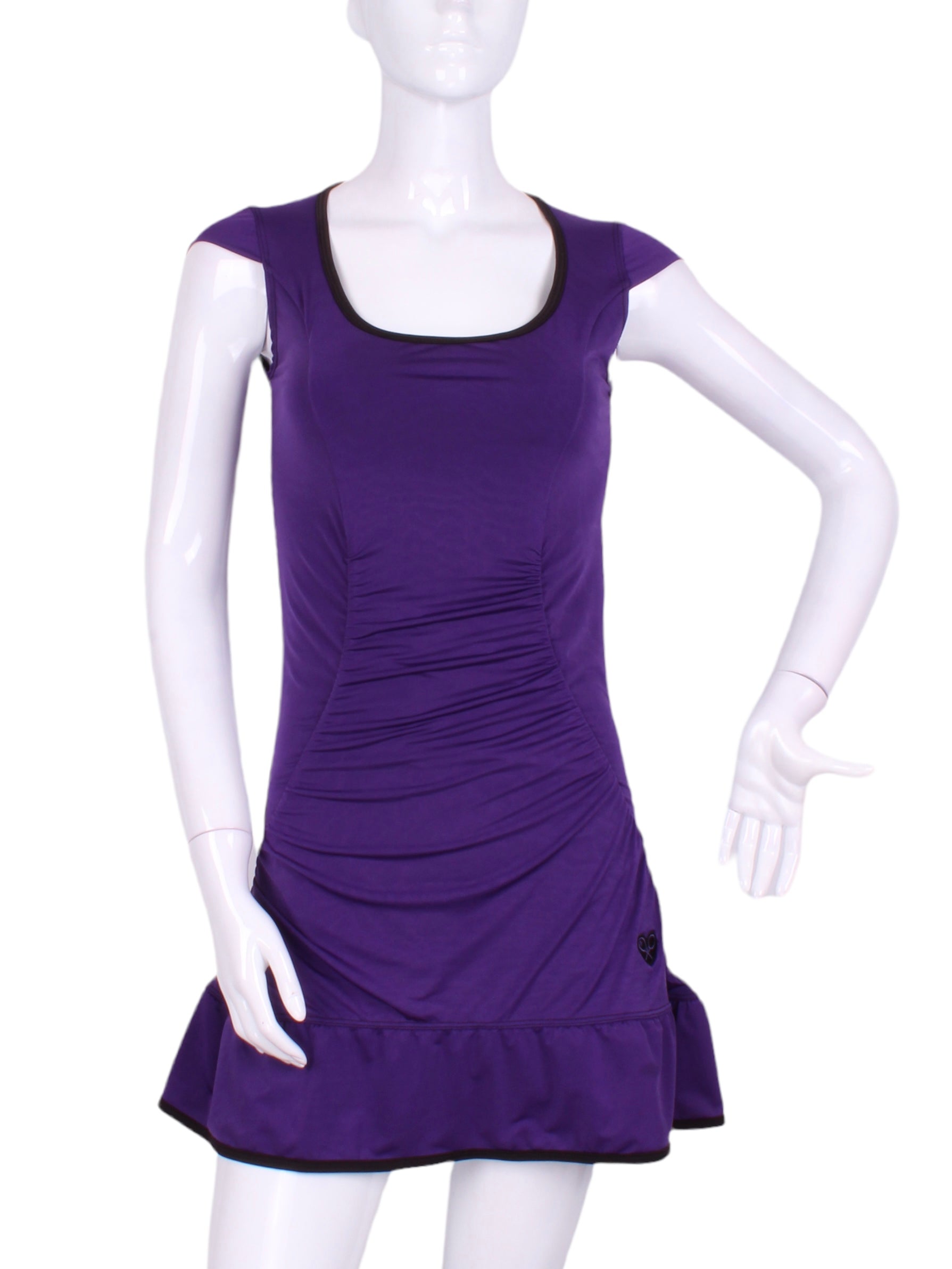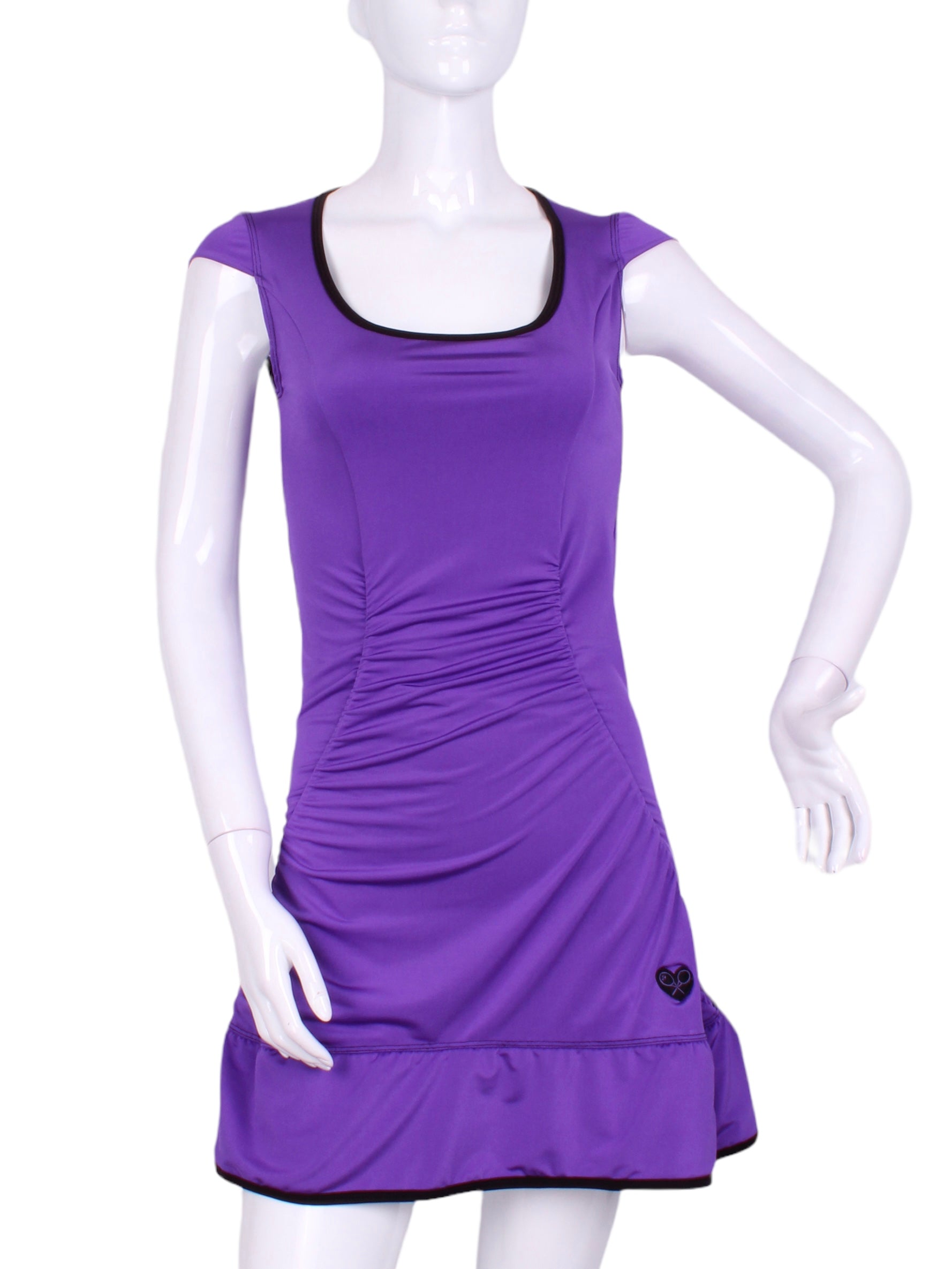 The Purple Monroe Tennis Dress With Ruching. The Monroe Dress delicately shows your feminine curves. It is a fitted dress, until the bottom where there is a cute ruffle. These purple pieces are very limited edition - only one made per size.  The Monroe has a scoop neckline and capped sleeves.