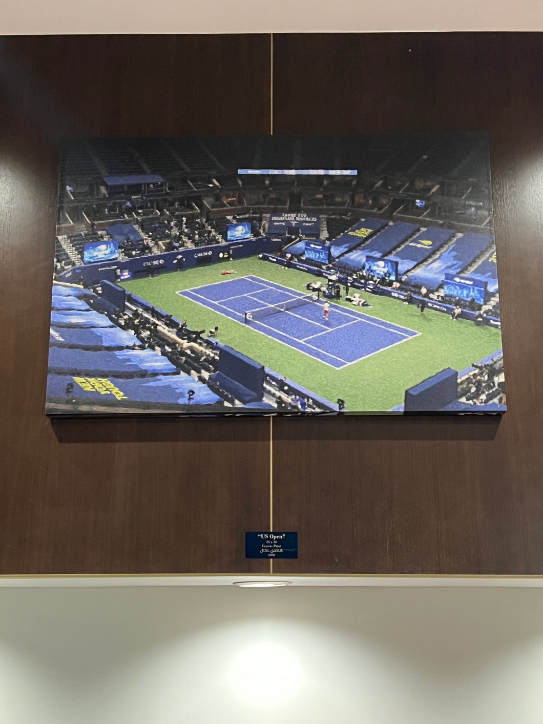 The central focus of the composition is the royal blue tennis court, representative of the iconic playing surface seen at the US Open. This deep and rich blue hue not only symbolizes the competitive intensity of the tournament but also serves as a visually striking foundation for the dynamic action depicted in the artwork.